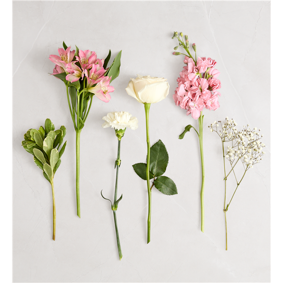 Our elegant bouquet in shades of blush pink and creamy white brings all the charm of a rustic country garden to the people you care about. Cascading blooms are hand-gathered with lush greenery and designed in a clear cylinder vase, creating a beautiful gift that delights with every detail.